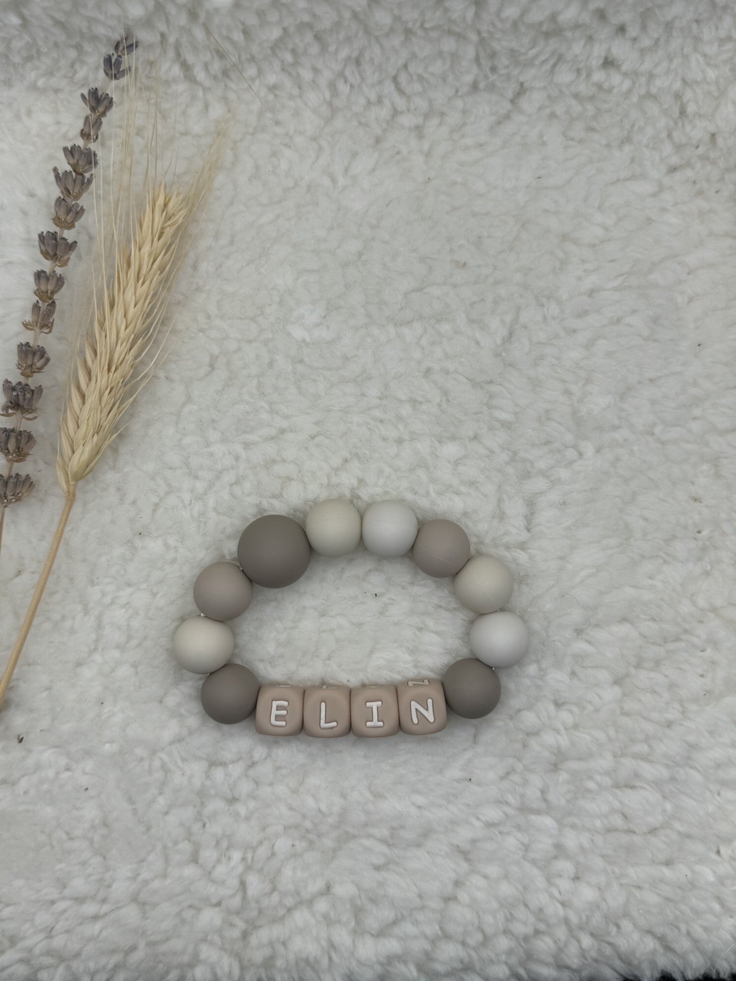 De bijtringen die ik maak worden met de hand gemaakt. Ook bij de bijtringen is het mogelijk om hem te personaliseren met de naam van je kindje. Hiervoor gebruik ik siliconen of onbewerkte houten kralen. Dit kan je helemaal zelf uitkiezen. En hoe leuk is het om een bijtring te combineren met een bijpassend speenkoord, voor jezelf of als cadeautje.