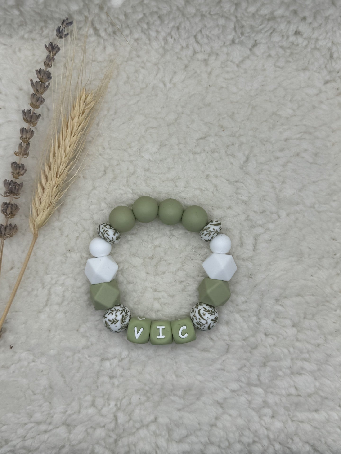 De bijtringen die ik maak worden met de hand gemaakt. Ook bij de bijtringen is het mogelijk om hem te personaliseren met de naam van je kindje. Hiervoor gebruik ik siliconen of onbewerkte houten kralen. Dit kan je helemaal zelf uitkiezen. En hoe leuk is het om een bijtring te combineren met een bijpassend speenkoord, voor jezelf of als cadeautje.