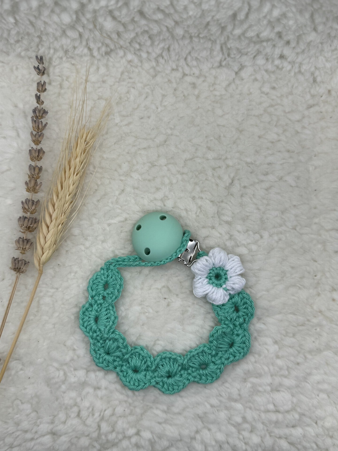 Raak de speen niet kwijt met dit mooie gehaakte speenkoord van RivKae. Je bevestigd dit speenkoord gemakkelijk met de veilige clip.