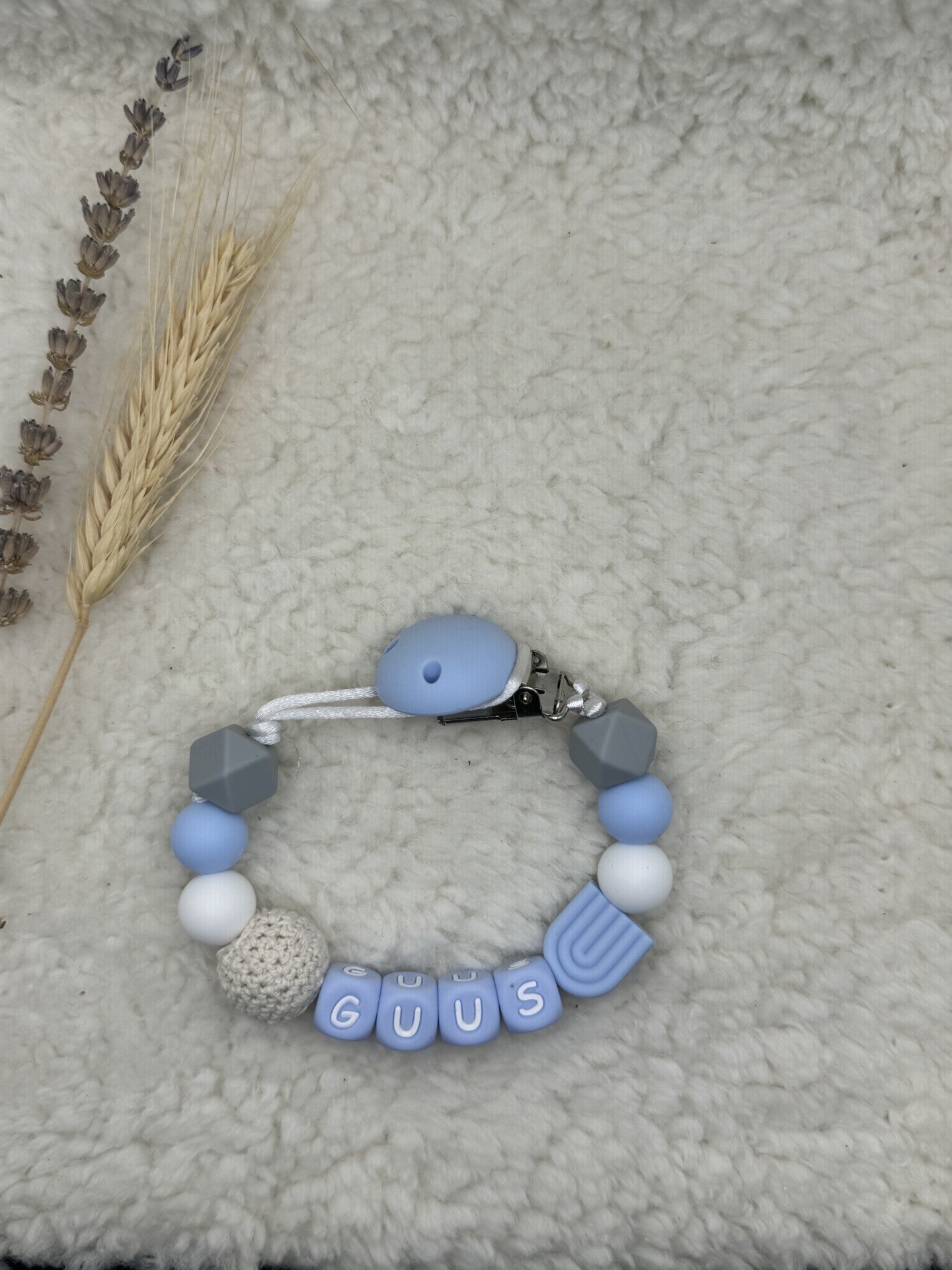 In het kader van de veiligheid zijn de speenkoorden met clip maximaal 30cm lang. Wanneer er een naam op een speenkoord komt, zal ik het aantal kralen aanpassen waardoor het speenkoord niet te lang wordt. Wij maken al onze speenkoorden zelf. Wij werken volgens de Europese Veiligheidsnormen (NEN 12586).