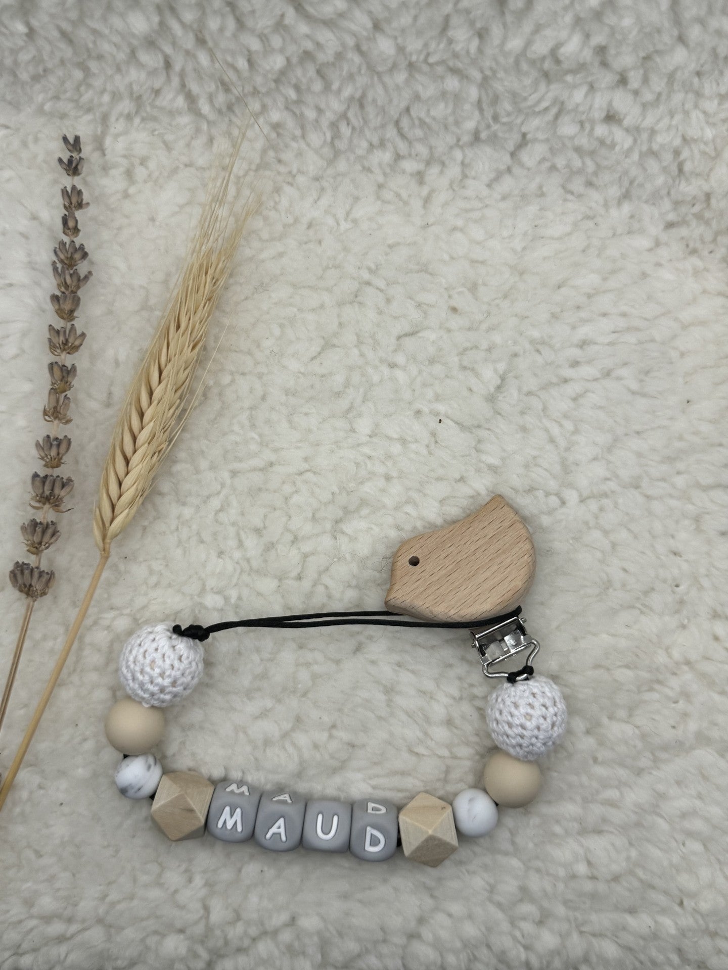 - Je kan het speenkoord schoonmaken met een vochtige doek. Denk eraan dat de houten clip niet te nat wordt.